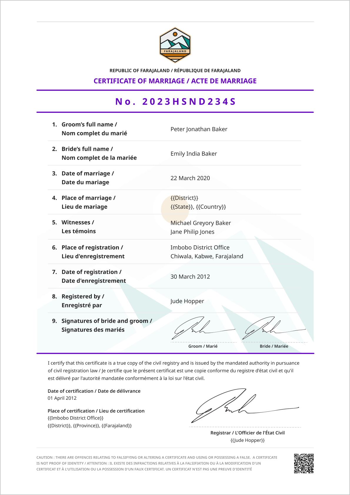 <figure><img src="https://3485090019-files.gitbook.io/~/files/v0/b/gitbook-x-prod.appspot.com/o/spaces%2FRziAMaeBMeyiTg5hfFq5%2Fuploads%2Fgit-blob-4daa256ec68f82ae62f07b1ca5e0c76f86cc5df3%2FFarajaland-marriage-certificate-v2.png?alt=media" alt=""><figcaption></figcaption></figure>