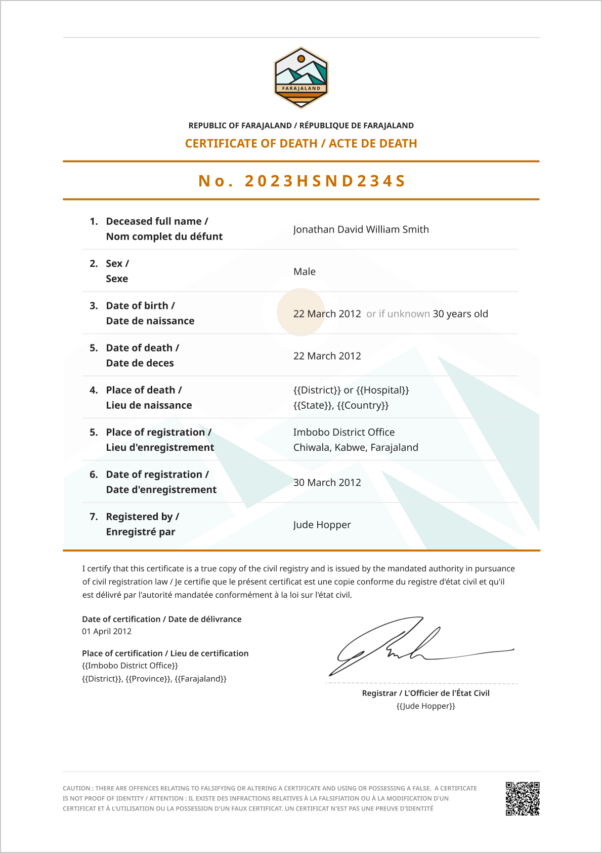<figure><img src="https://3485090019-files.gitbook.io/~/files/v0/b/gitbook-x-prod.appspot.com/o/spaces%2FRziAMaeBMeyiTg5hfFq5%2Fuploads%2Fgit-blob-d49b5a3179c29471cdd8bdd7e177bdb8771177df%2FFarajaland-death-certificate-v2.png?alt=media" alt=""><figcaption></figcaption></figure>