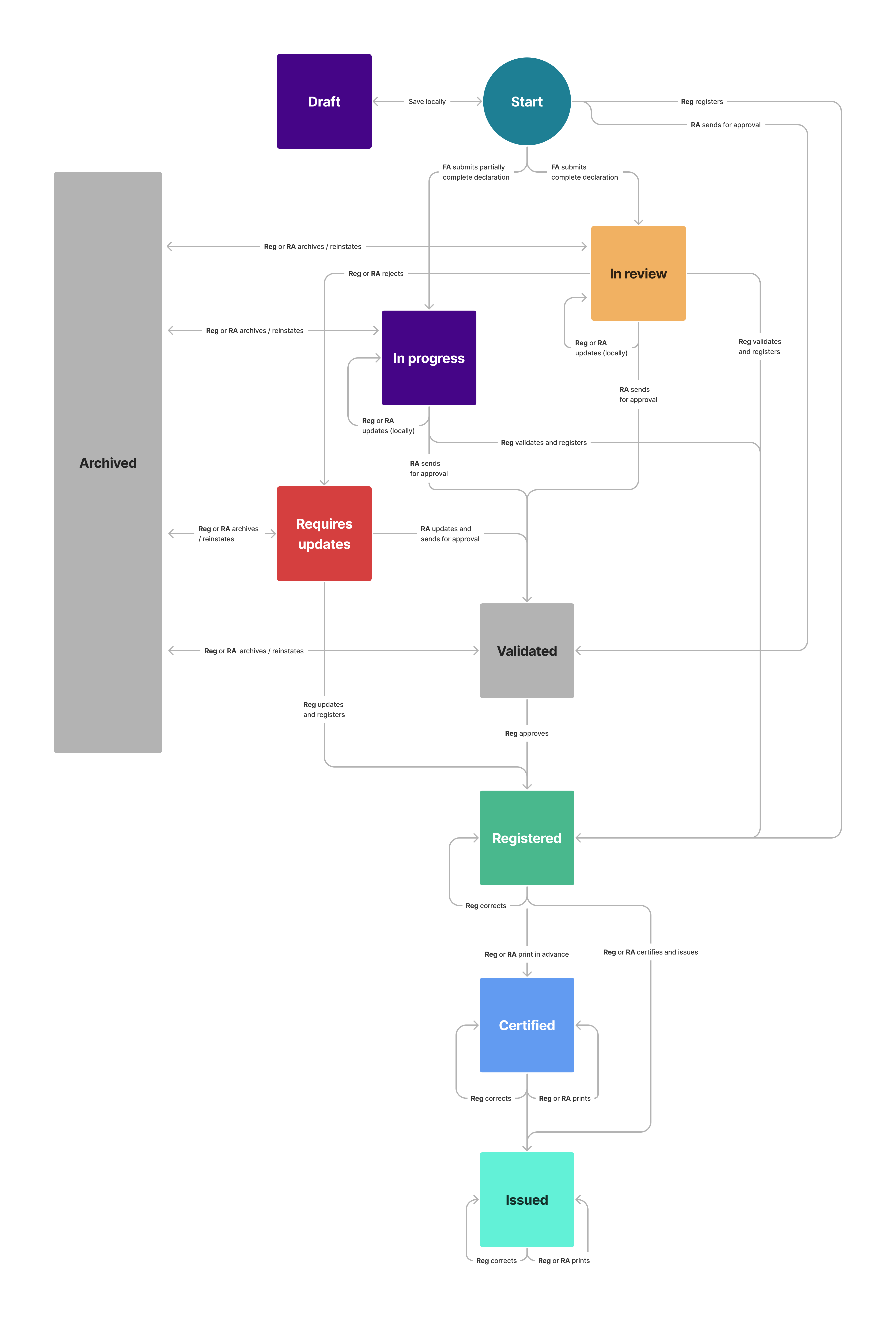 The status flow diagram shows all the vital event record statuses in OpenCRVS and how it is possible to move from one to the next.