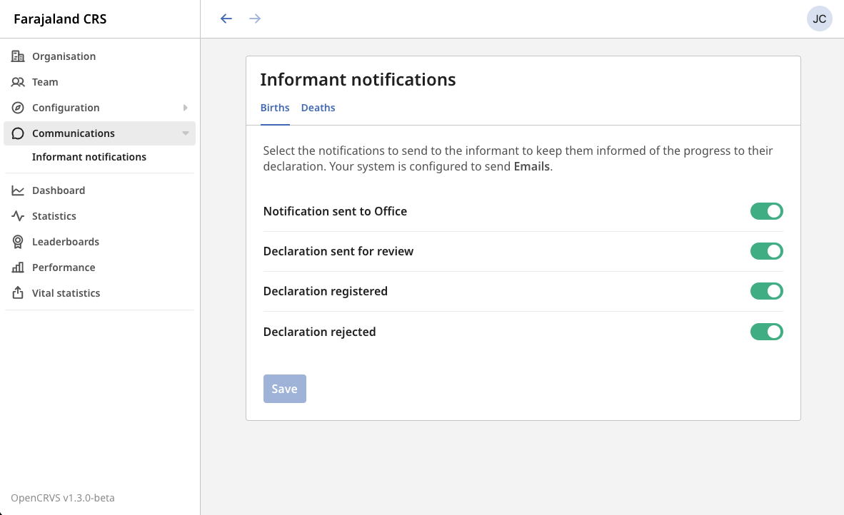 In **production**, OpenCRVS sends automated messages at important times to staff and beneficiaries. In **development** and **qa** environments, messages are not delivered. You can edit the languages and content of all messages [here](https://github.com/opencrvs/opencrvs-countryconfig/blob/develop/src/api/content/notification/notification.json).