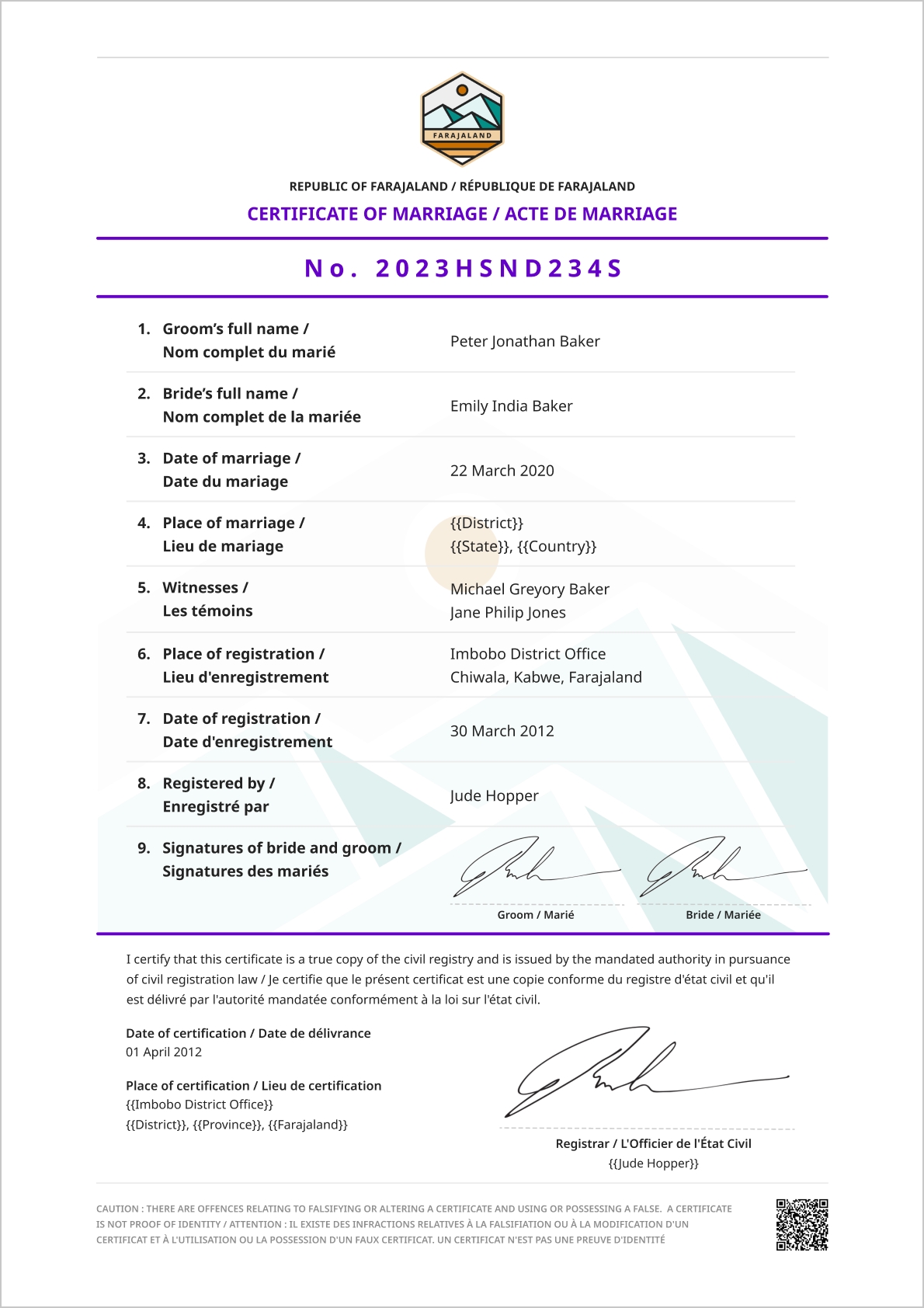 The following birth and death certificate samples have been configured to meet the needs of the Farajaland context.
