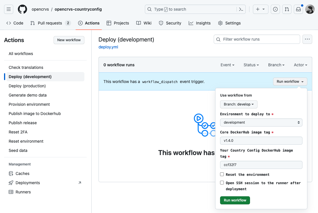 Before you can deploy, you need to make sure that your country configuration Docker image has compiled and has been pushed to your container registry (E.G. Dockerhub).  This was explained previously in [4.3.5.2](https://documentation.opencrvs.org/v1.5/setup/3.-installation/3.3-set-up-a-server-hosted-environment/4.3.5-provisioning-servers/4.3.5.2-building-pushing-and-releasing-your-countryconfig-code)&#x20;