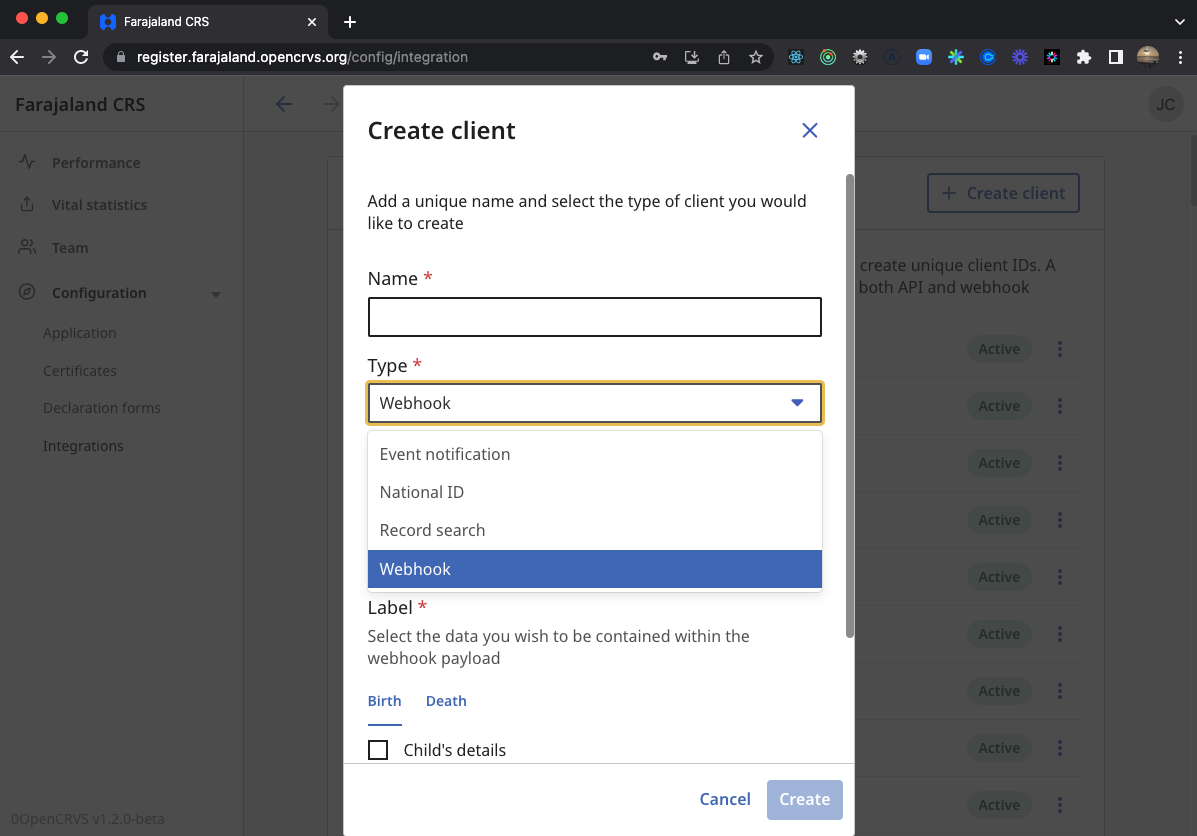 Webhook: Allow any other system to subscribe to event in OpenCRVS and retrieve a customisable payload of registration data. Allow any system to react immediately when a birth or death is registered.