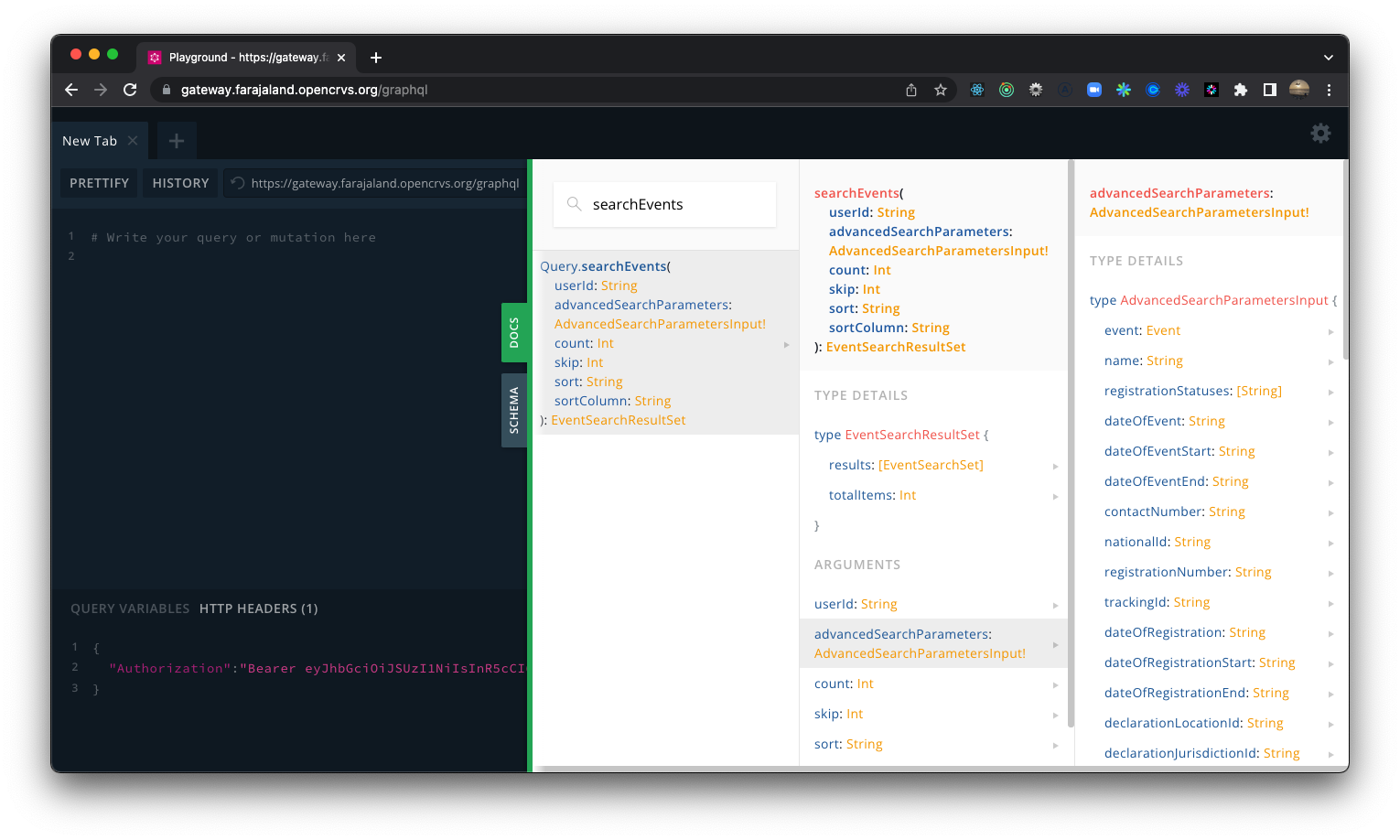 You can browse to the [GraphQL Playground](https://www.apollographql.com/docs/apollo-server/v2/testing/graphql-playground/) using an authorization header to view the full documentation for the searchEvents GraphQL query.
