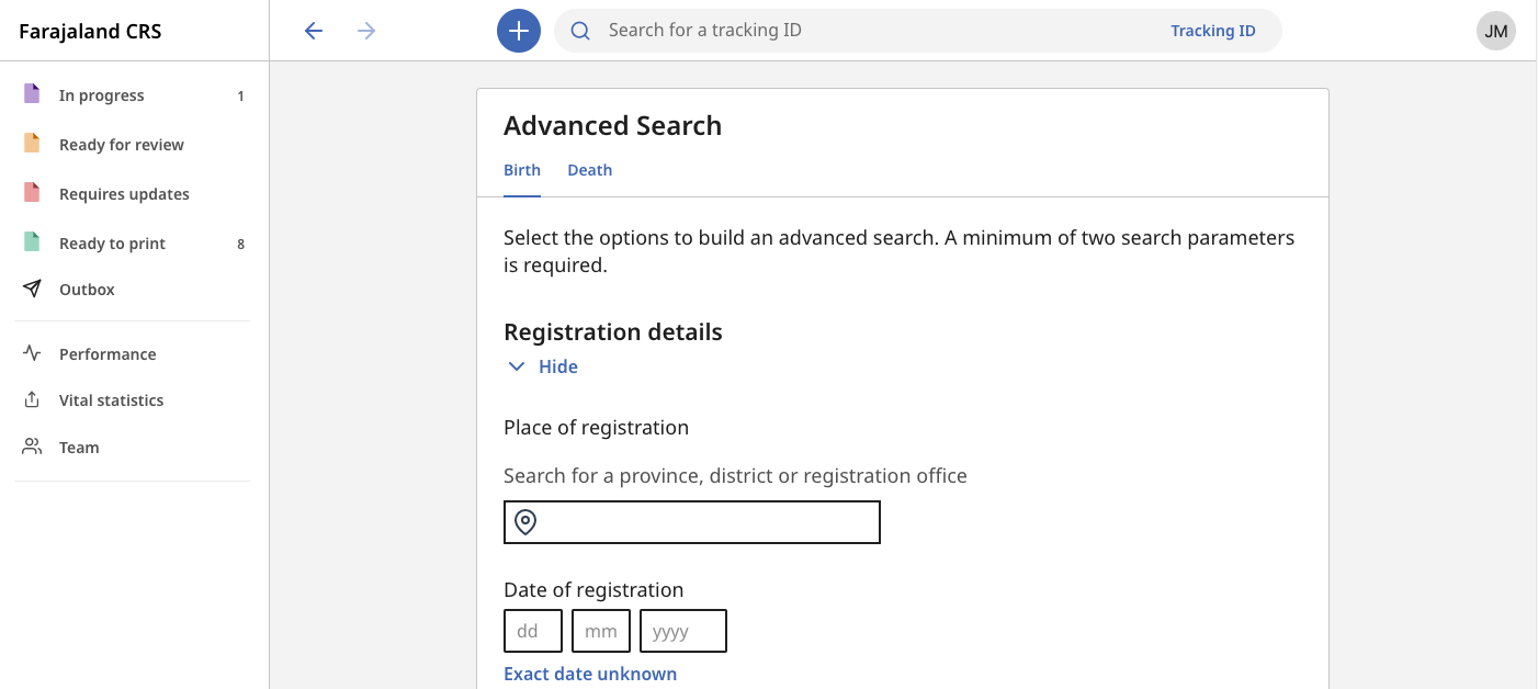 The Record Search client can perform an advanced search of civil registration records. Use this to help support social protection systems, check the existence of civil registration records or check citizen demographics.