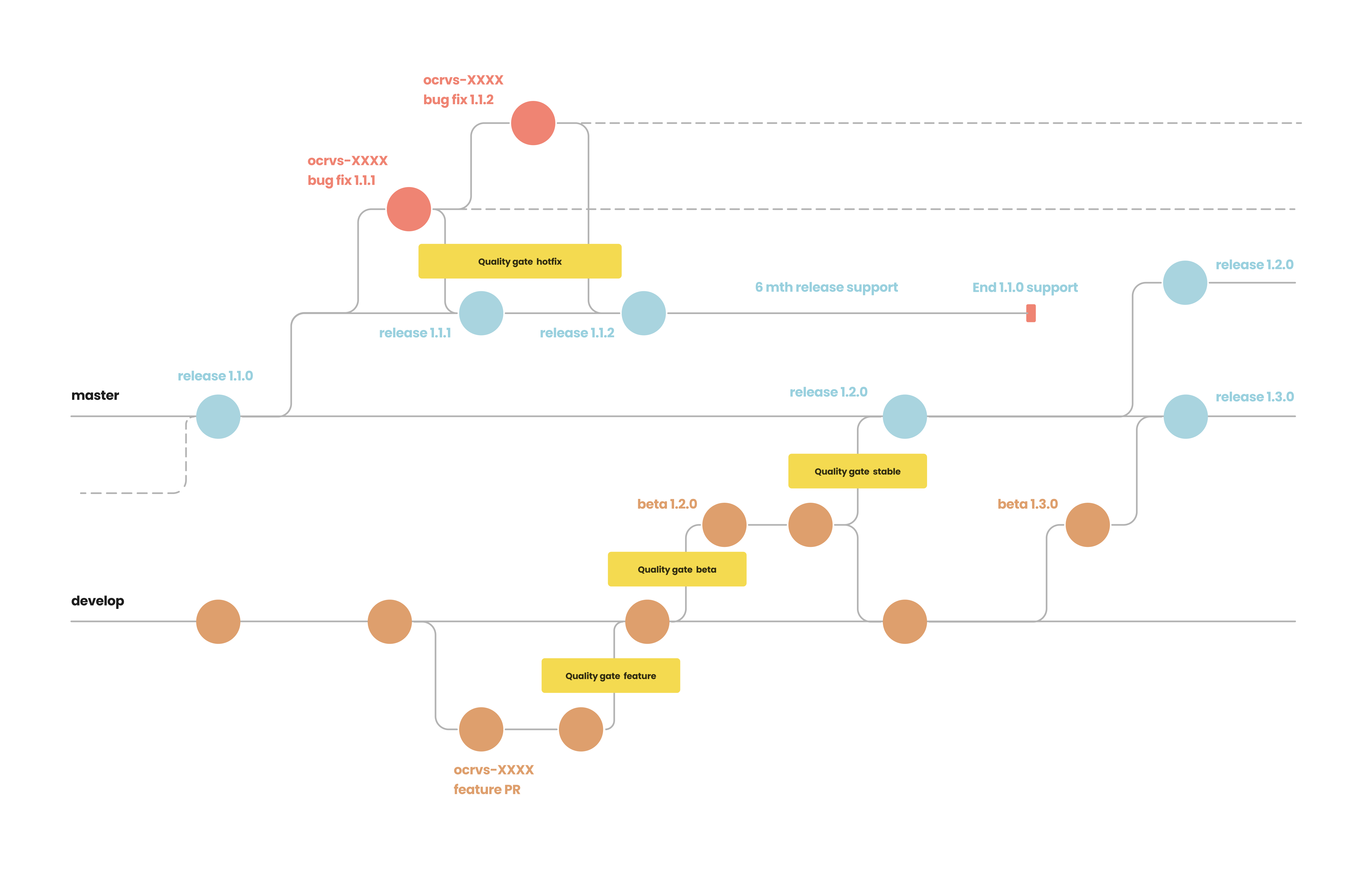 The OpenCRVS Core team issue product releases once every 4 months with each release receiving 6 months of bug fix (hotfix) support.