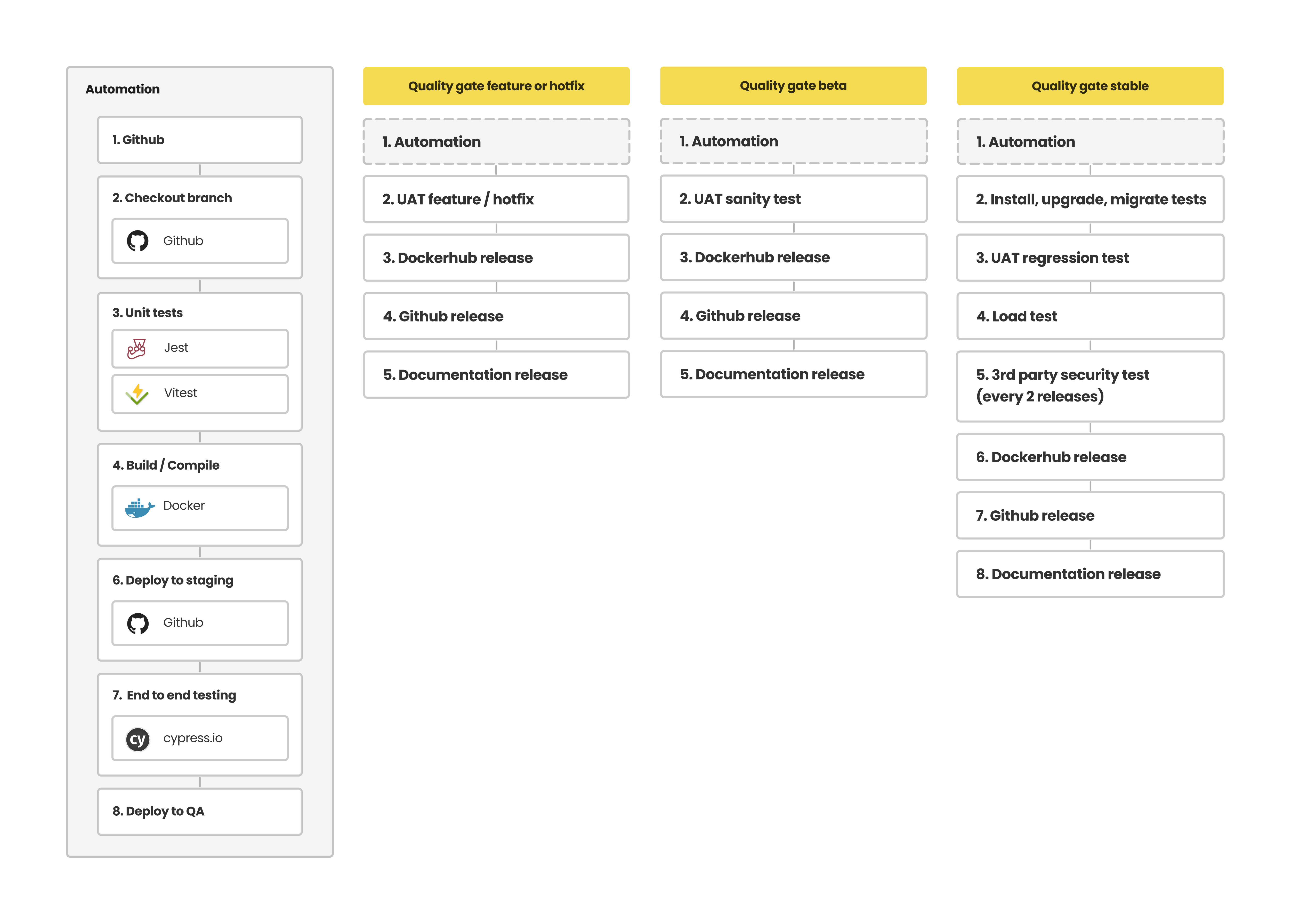 Specific tests to QA the defects. Small regression / smoke-test to ensure nothing impacted. In the case of Farajaland, latest compatible version is always deployed in conjunction with the core version being tested. End-to-end testing (Cypress).