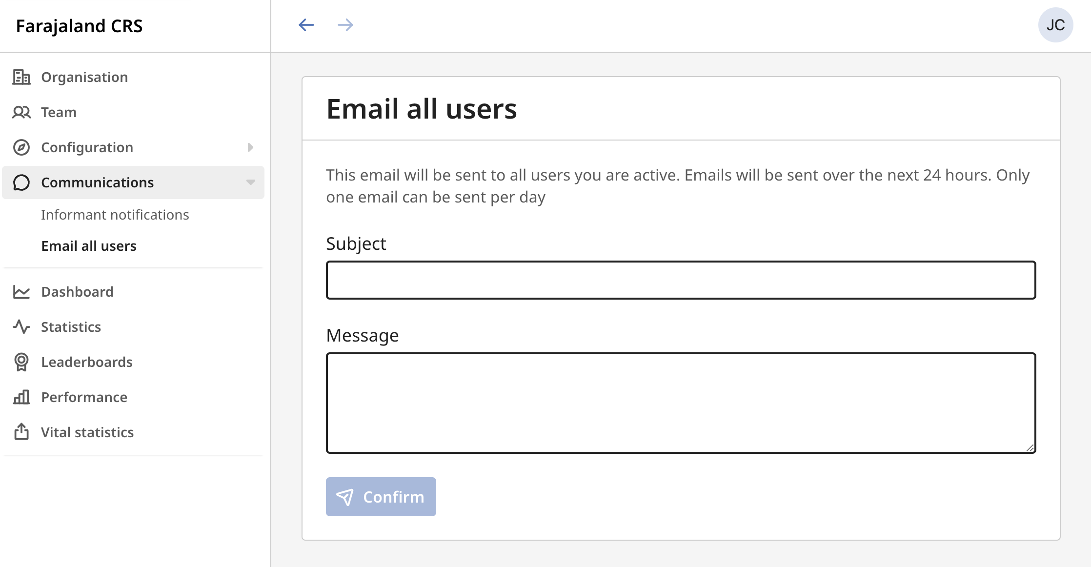 National System Admin: Email all users feature Given that upon an upgrade between versions of OpenCRVS, that users cache is cleared, it is important to inform staff to submit any draft applications before the upgrade date. We introduced an "Email all users" feature so that National System Admins can send all staff messages. This feature can be used for any other all staff comms that are deemed required.