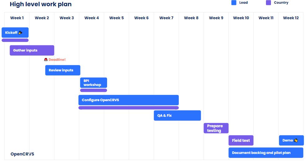 Detailed below is an example of a work plan for a pilot of OpenCRVS in a country. You will notice that this is an **integrated** programme of work because technology alone cannot bring about a true transformation of civil registration in a country. Programme workstreams include: &#x20;
