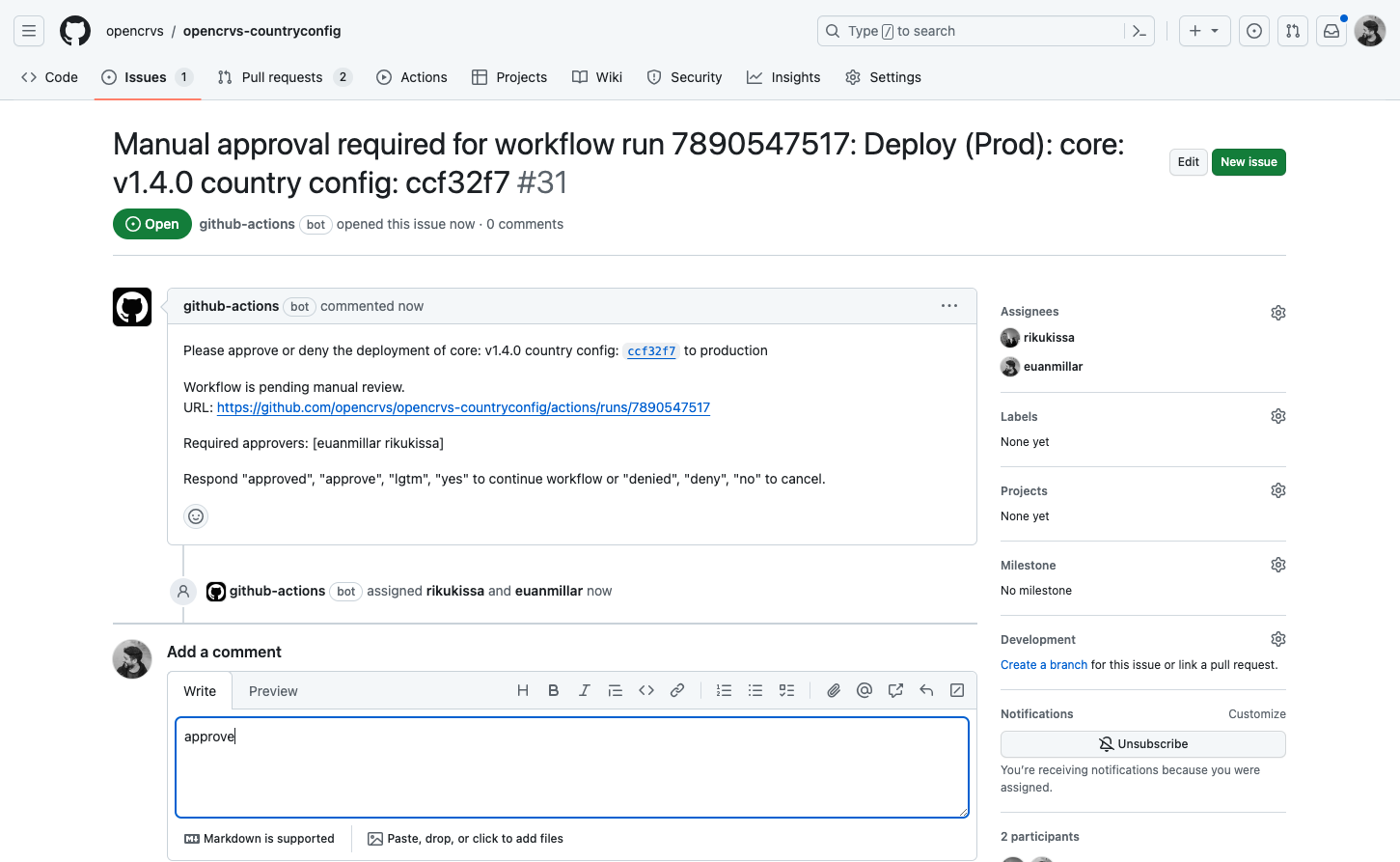 In order to stop the Deploy (production) action from being accidentally run, an approval check has been implemented.  When the action runs, a Git issue will open requiring repository administrators to reply approve or deny in order for the action to continue.&#x20;