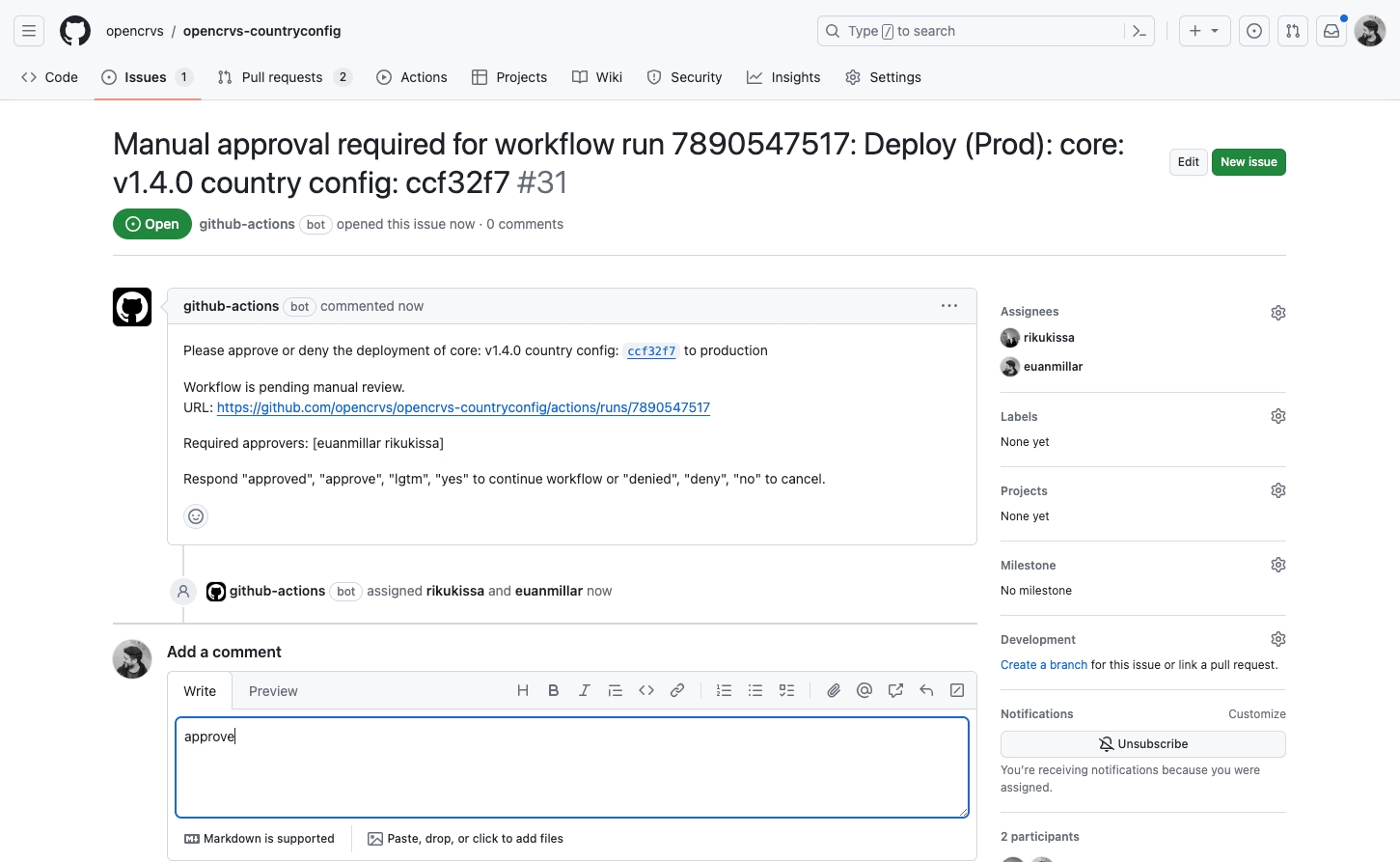 In order to stop the Deploy (production) action from being accidentally run, an approval check has been implemented. When the action runs, a Git issue will open requiring repository administrators to reply approve or deny in order for the action to continue.