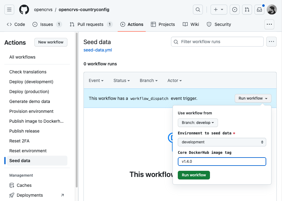 Run the **Seed data** Github Action with the same OpenCRVS Core Dockerhub image tag you used in the Deploy actions to seed the databases with your data.