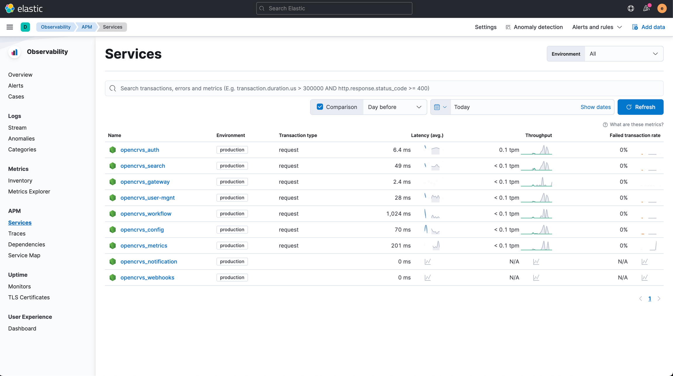 The OpenCRVS monitoring stack comes with a pre-installed Application Performance Monitoring tool (APM). This tool collects performance metrics, errors and HTTP request information from each of the services in the OpenCRVS stack. You can find this tool in Kibana by navigating to Observability -> APM -> Services. This tool can be used to catch anomalies such as errors happening inside the services. It can also be used to detect bottlenecks and to know which services should be scaled up.