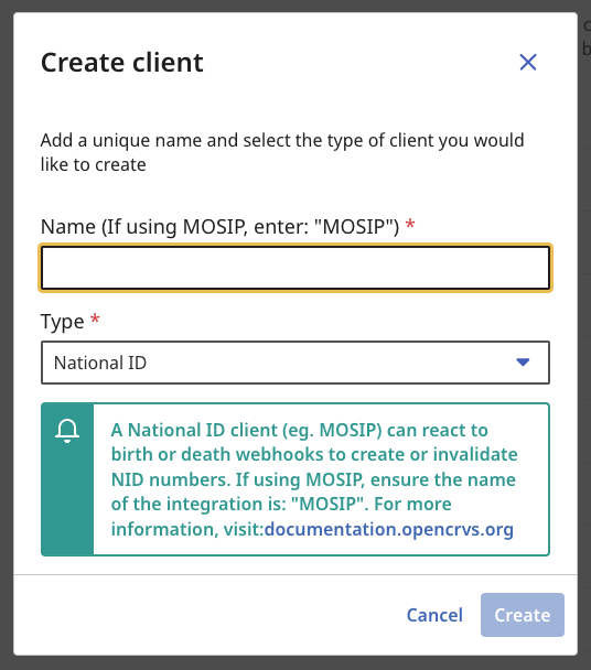 When creating a National ID client, you must give it a name. If you are installing OpenCRVS alongside MOSIP, enter "MOSIP" (without quotation) for the name, otherwise you can give it any name you like and take advantage of the default functionality explained below.