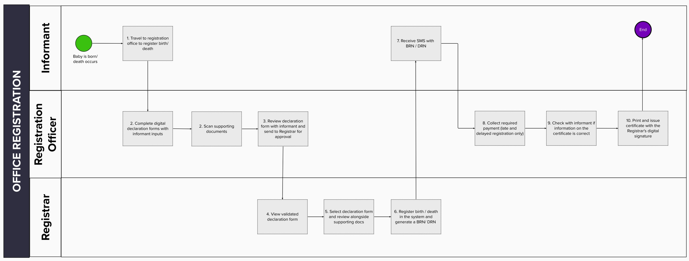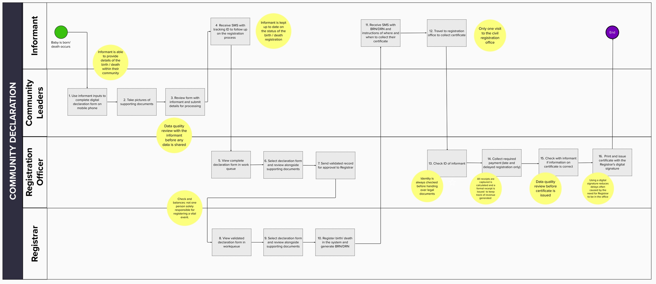 Provides an overview of the Farajaland business processes digitally enabled by OpenCRVS