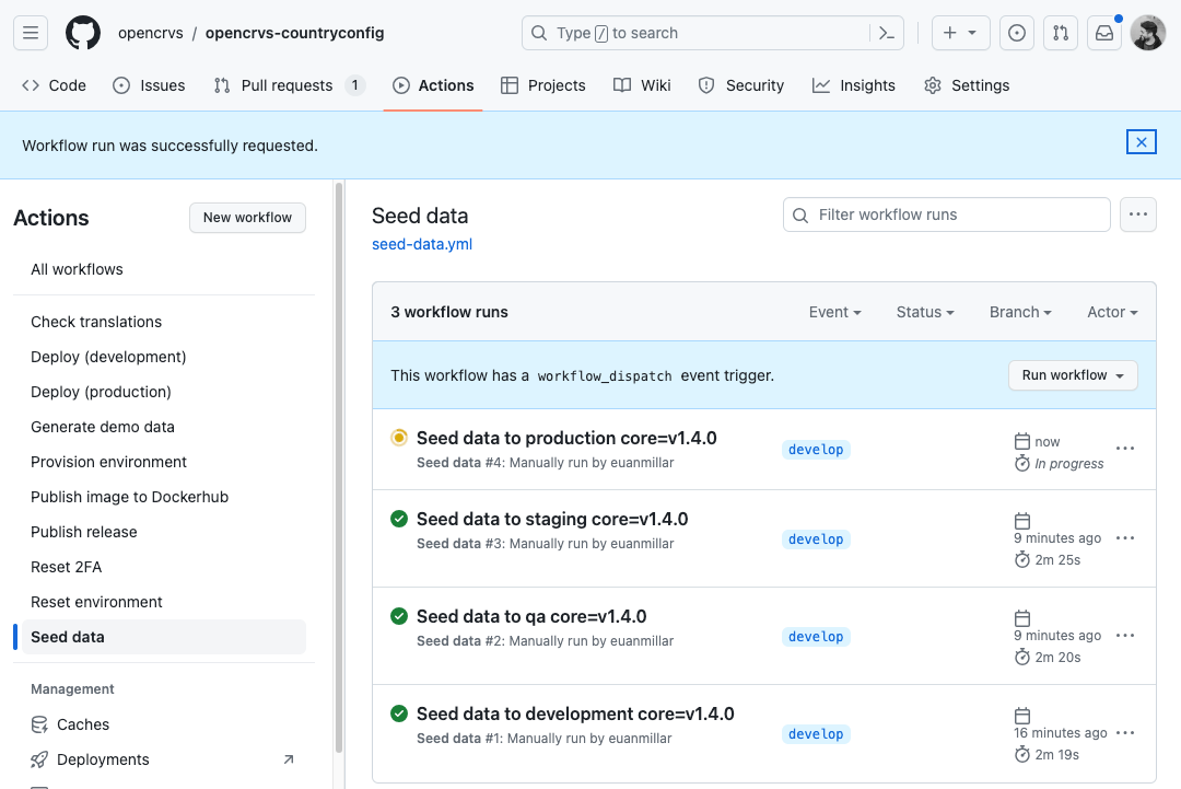 Run the Seed data Github Action with the same OpenCRVS Core Dockerhub image tag you used in the Deploy actions to seed the databases with your data.