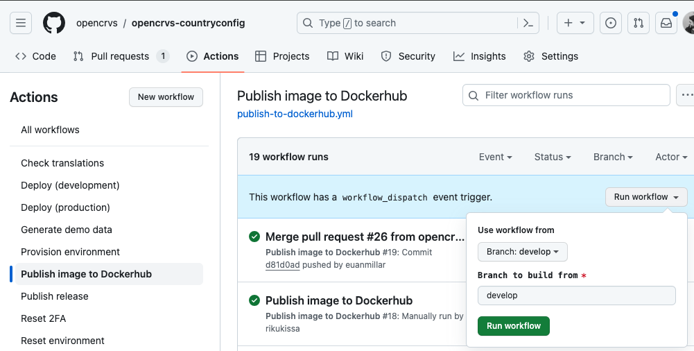When you merge any pull request into the "main", "master" or "develop" branch, or if you explicitly run the "Publish image to Dockerhub" Gthub Action, a docker container image will be built and pushed to Dockerhub for your **countryconfig** microservice.