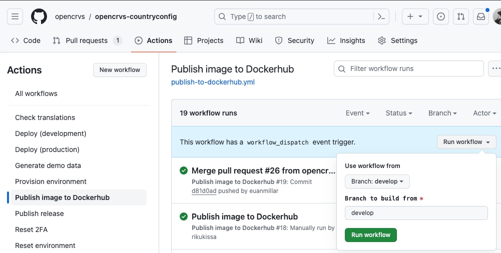 When you merge any pull request into the "main", "master" or "develop" branch, or if you explicitly run the "Publish image to Dockerhub" Gthub Action, a docker container image will be built and pushed to Dockerhub for your countryconfig microservice.