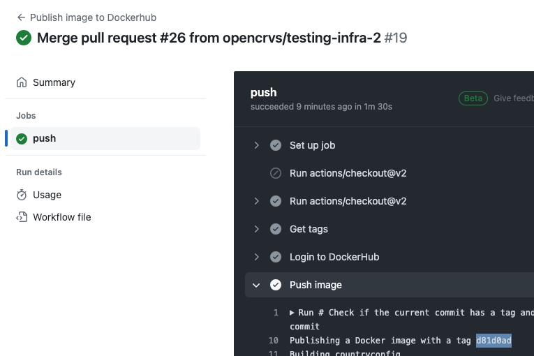 If you look at the logs for each build, you can see the image tag associated with the Docker container image. You use this tag in the Deploy action.