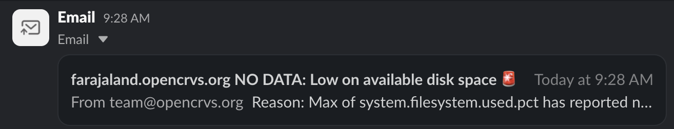 <table><thead><tr><th>Step</th><th>Explanation</th></tr></thead><tbody><tr><td>Provisioning &#x26; Deployment pipelines for Backup, QA, staging &#x26; production working</td><td>Your Github Actions should all be running without any errors in logs.  No red crosses!</td></tr><tr><td>SMTP service tested for emails and alerts</td><td>Not only should you confirm that emails are sending for staff, but you should receive emailed alerts too. If you have enabled Slack as the ALERT_EMAIL you would see an SSH login alert in Slack like this: <img src="https://content.gitbook.com/content/vgBjh6h3DfeeMhA5gwiP/blobs/5bvQQnbwoPmJD8u8mkFA/Screenshot%202024-11-14%20at%2009.50.00.png" alt=""></td></tr><tr><td>Setup DNS &#x26; TLS (HTTPS)</td><td>Your SSL certificate should be valid. <img src="https://content.gitbook.com/content/vgBjh6h3DfeeMhA5gwiP/blobs/jRiNf3YdUtIipzWFVi5g/Screenshot%202024-11-14%20at%2009.57.13.png" alt=""></td></tr><tr><td>Verify production backups restore on staging (pre-prod/mirror)</td><td>Ensure that the <a href="../3.-installation/3.3-set-up-a-server-hosted-environment/4.3.7-backup-and-restore">backup &#x26; restore</a> test is completed as documented.</td></tr><tr><td>Alert sent of SSH login</td><td>Ensure the SSH login alert is firing as mentioned above in the "SMTP service tested" description.</td></tr><tr><td>Verify a warning is received when disk space is at 50%, alert at 70%</td><td><p>To test this you need to create a temporary large file on your server.  Kibana will broadcast an alert. <img src="https://content.gitbook.com/content/vgBjh6h3DfeeMhA5gwiP/blobs/Yy87Nz6zsHwGCSFVHrCV/Screenshot%202024-11-14%20at%2017.22.40.png" alt="">    This example terminal command creates a file of 200G: </p><pre class="language-bash"><code class="lang-bash">sudo dd if=/dev/zero of=/large-file-to-trigger-alerts bs=200G count=100.