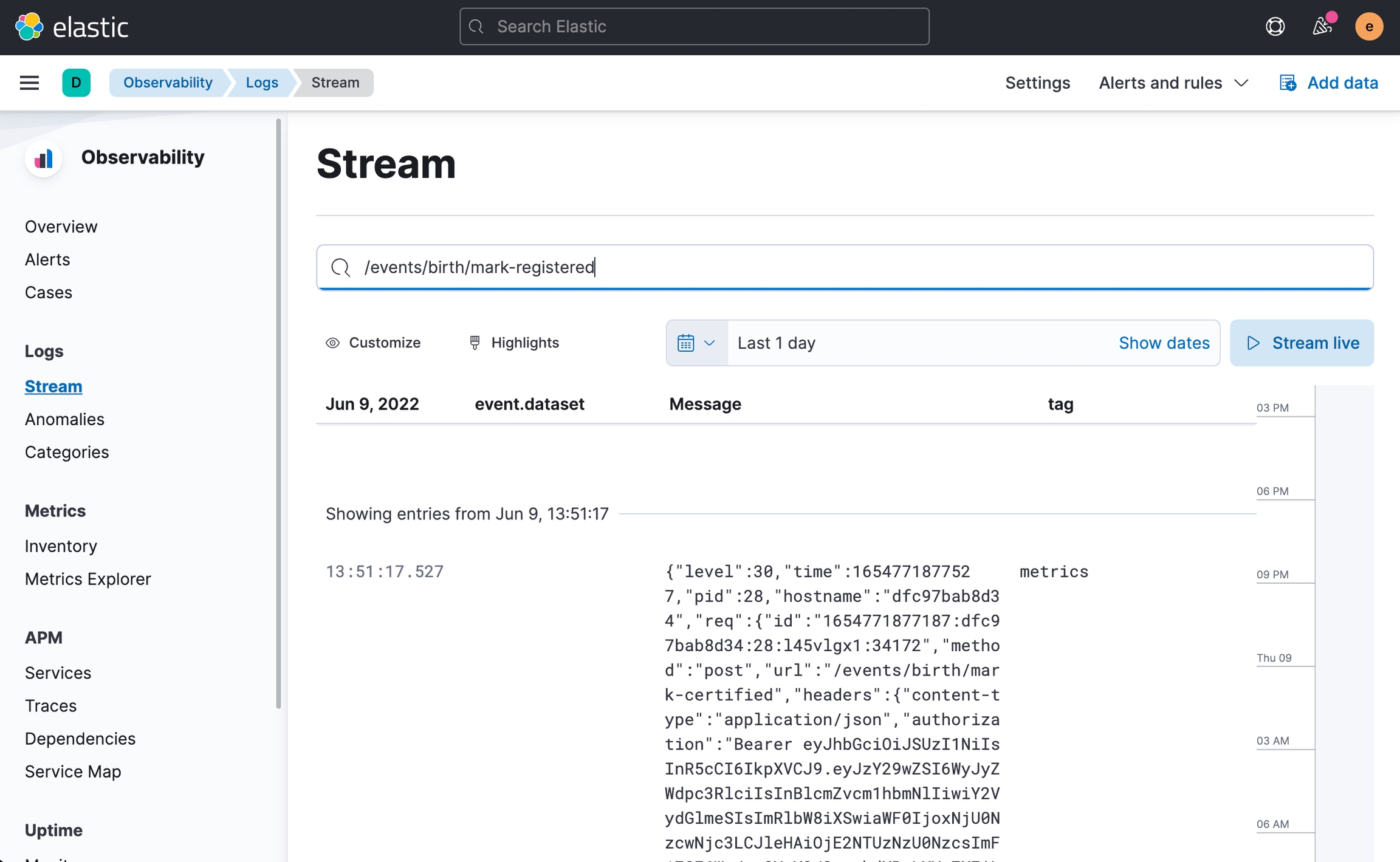 In the log stream view, you can see that all log items related to HTTP requests contain a header field called elastic-apm-traceparent.