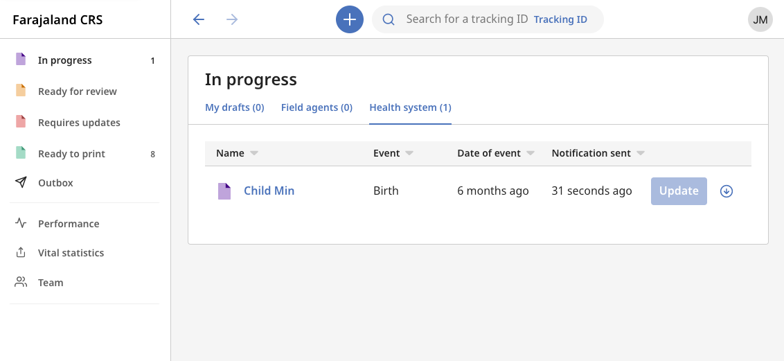 An Event Notification client can submit full or partial birth or death applications into an OpenCRVS' office "In Progress" or "Ready For Review" workqueue. Usually these clients are Hospitals, but technically these clients could be any system and the "Health system" label on the workqueue tab could be content managed accordingly.